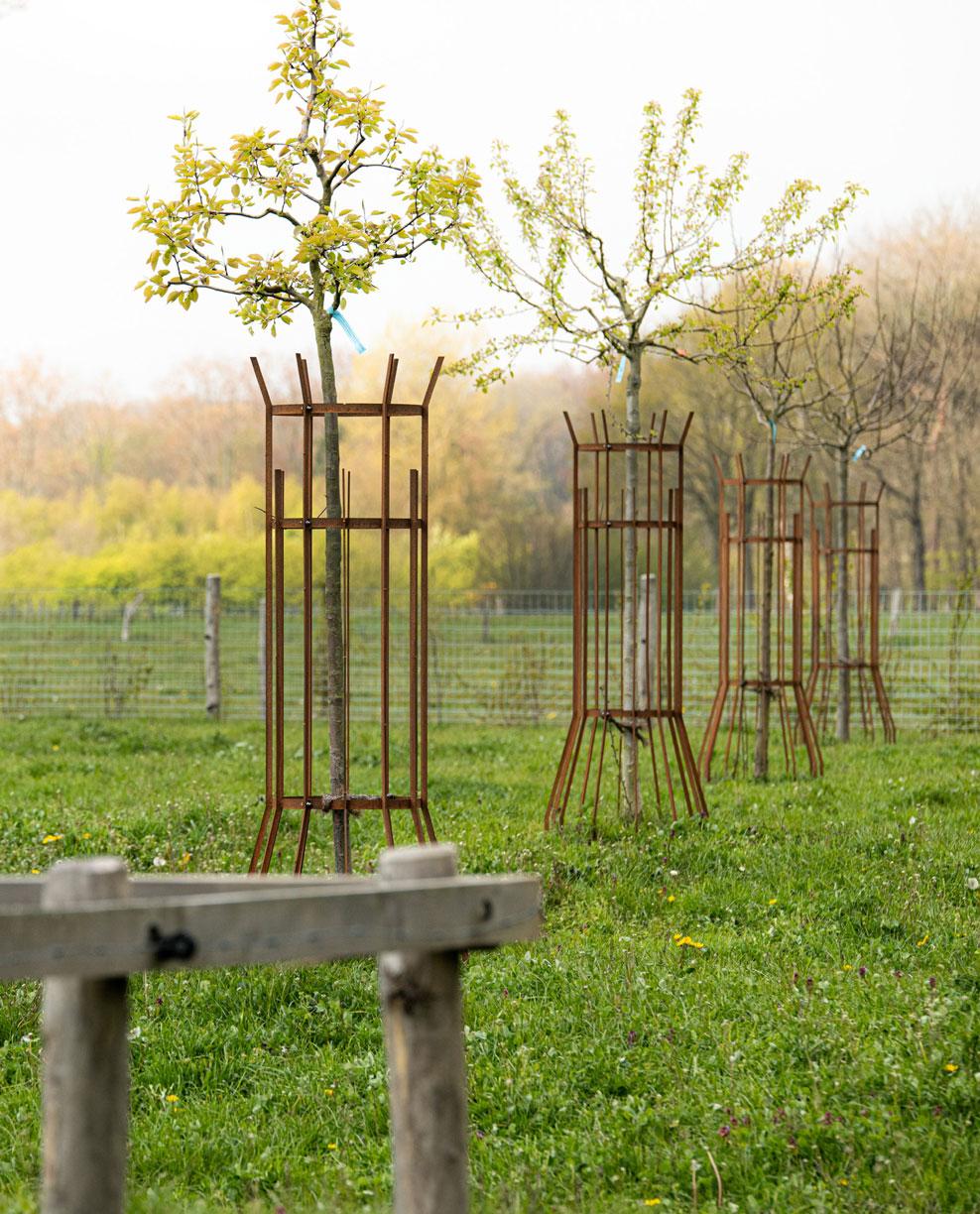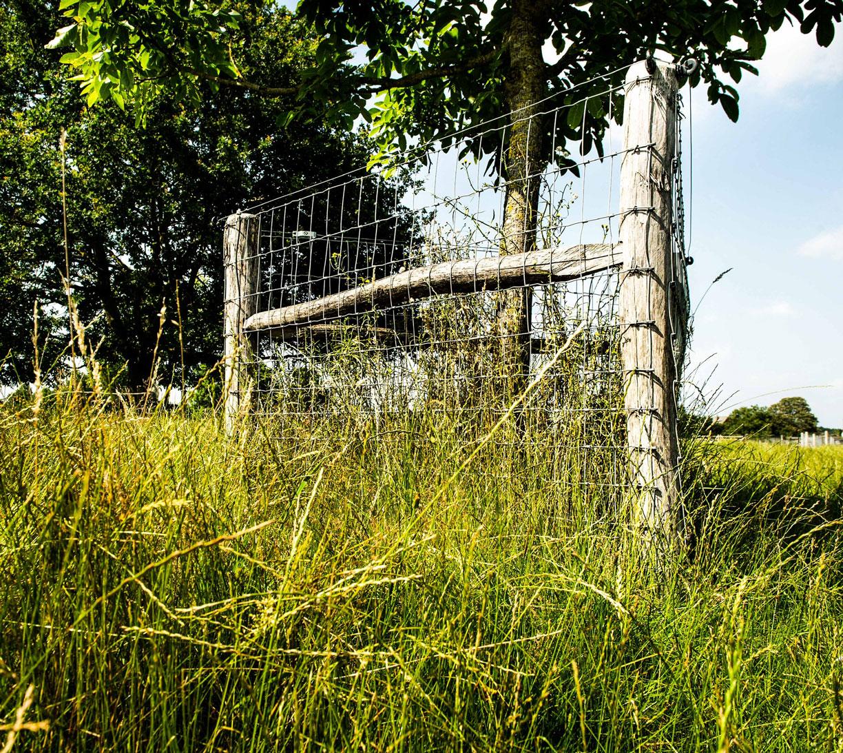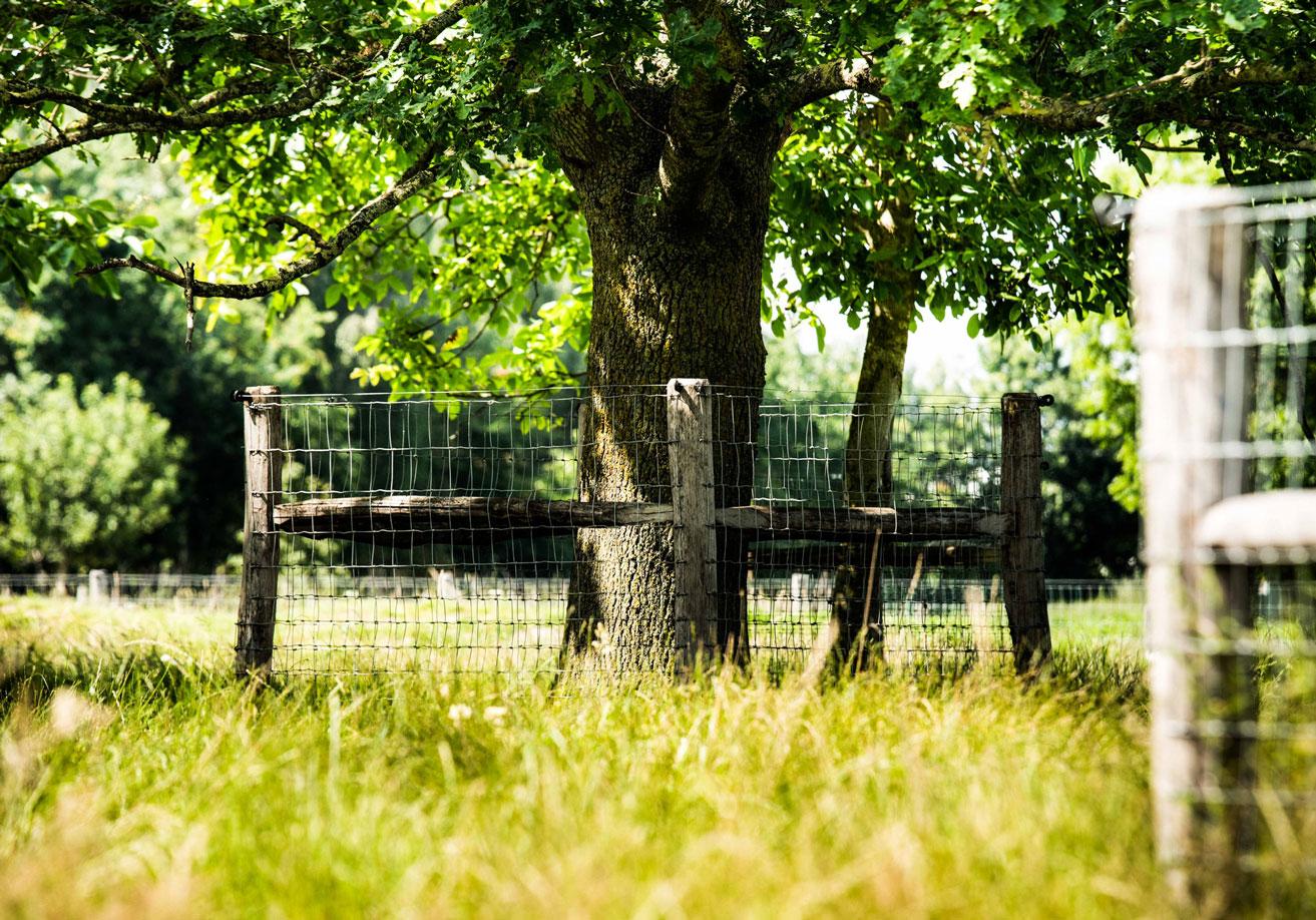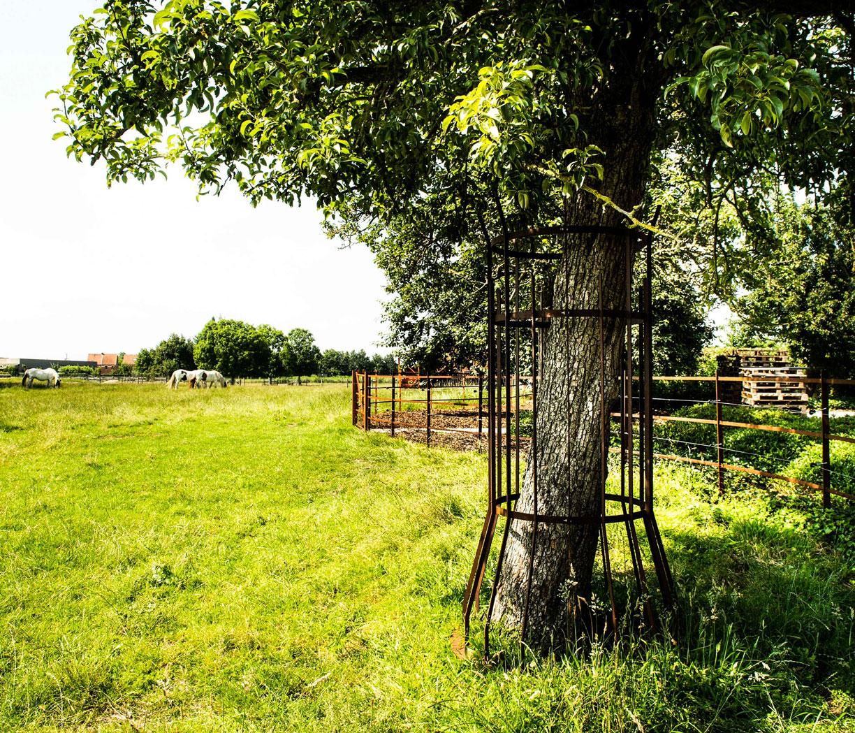 Een subtiele draadgaasomheining met robuuste houten palen beschermt de boom zonder het landschap te verstoren. Dankzij een wire protect tot op de grond bescherm je de stam van de boom tegen grote én kleine grazers.