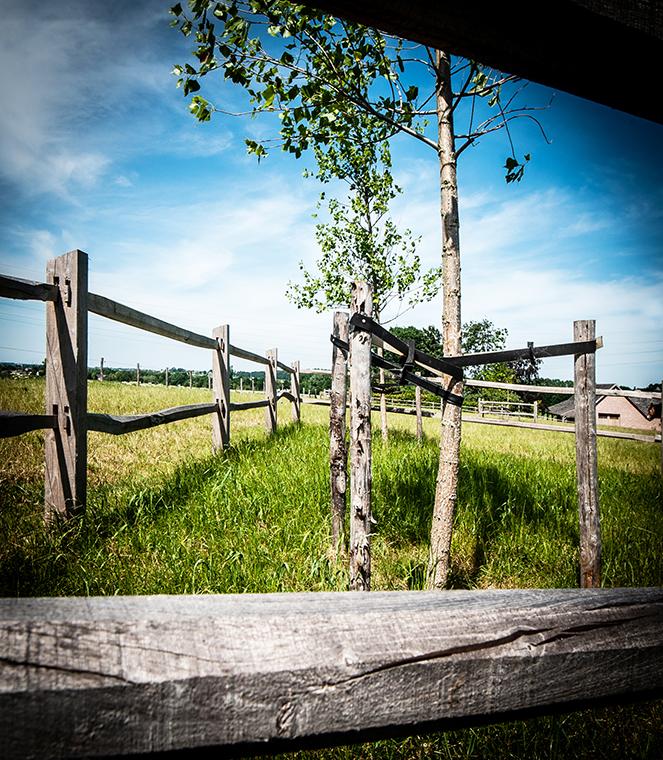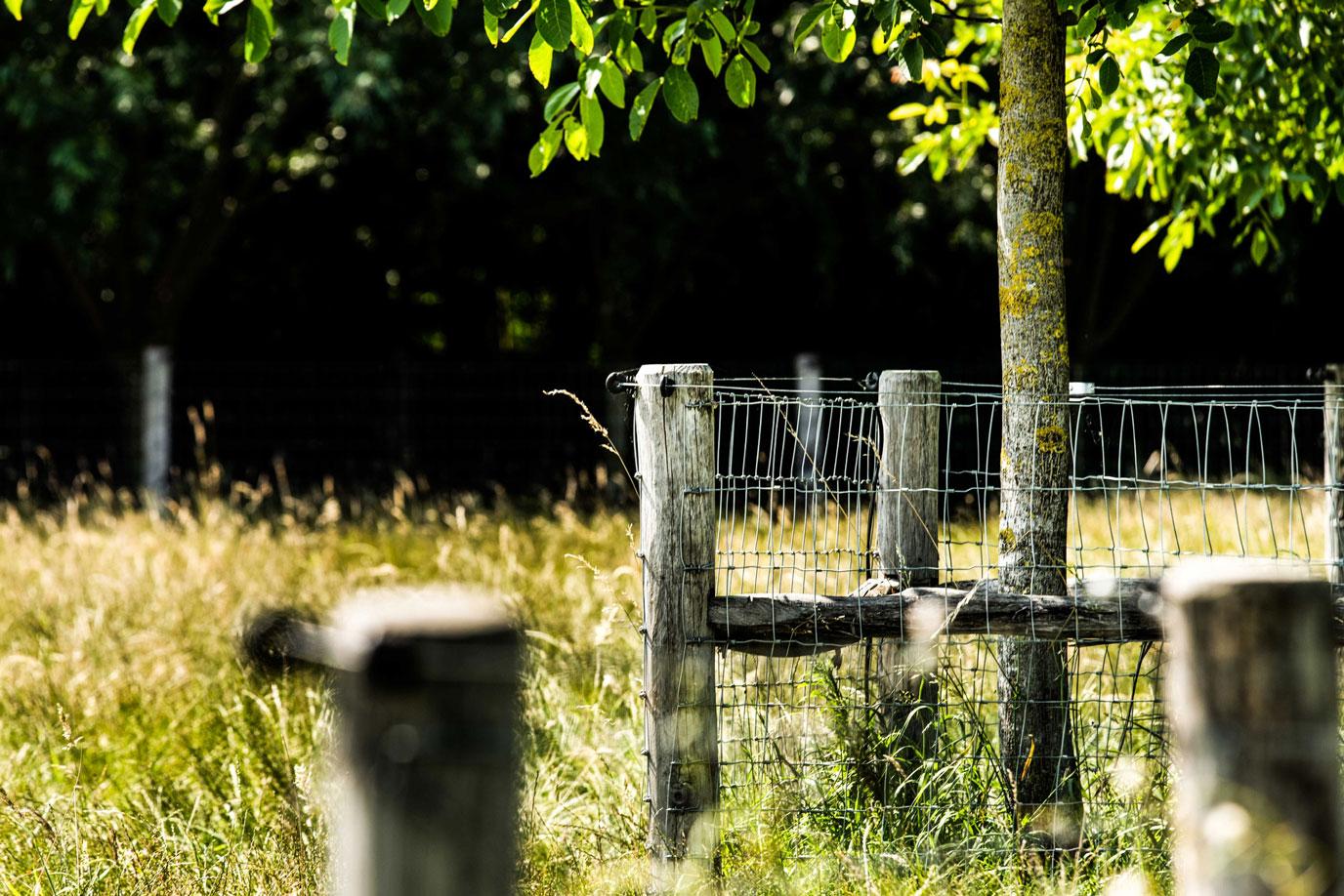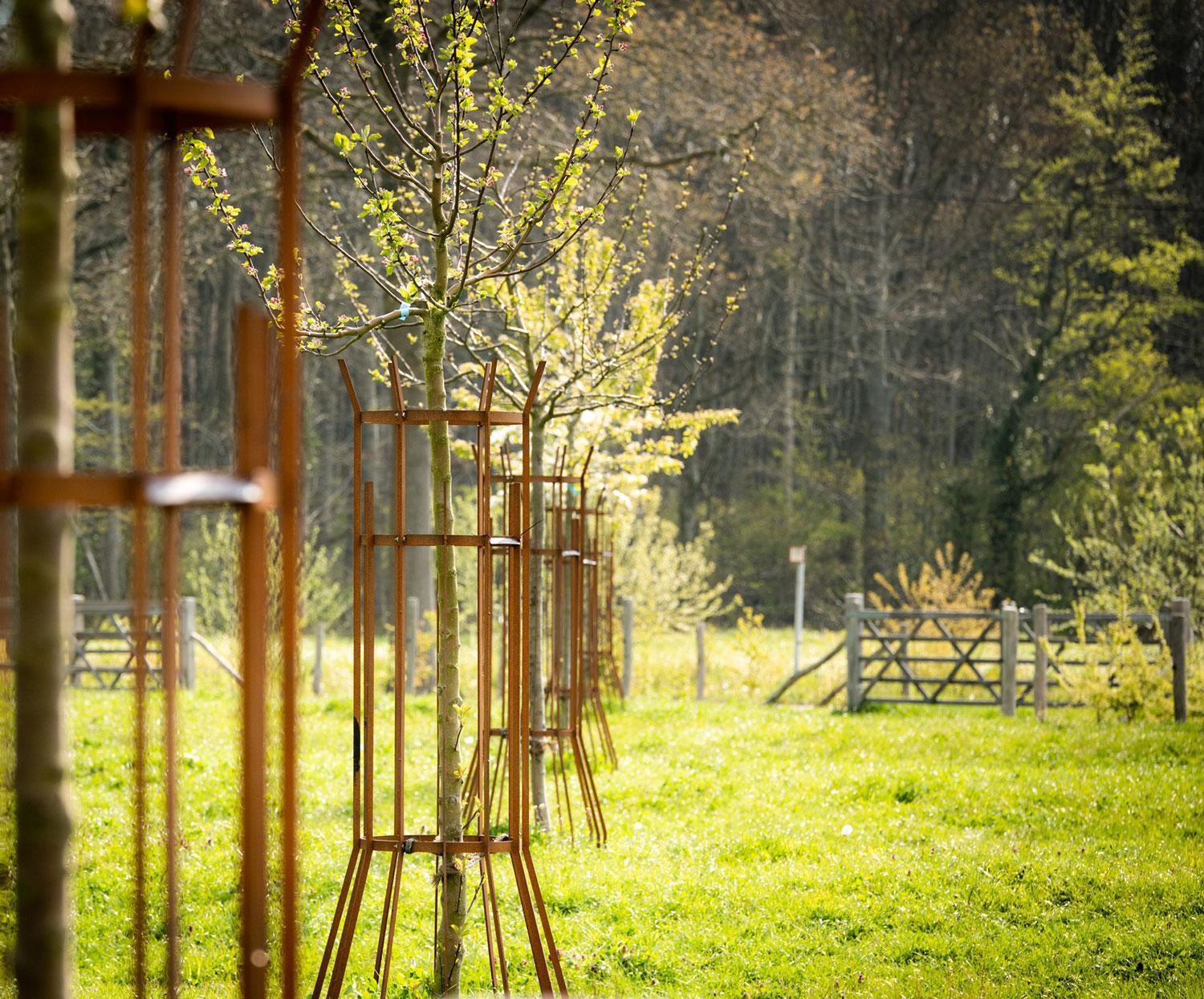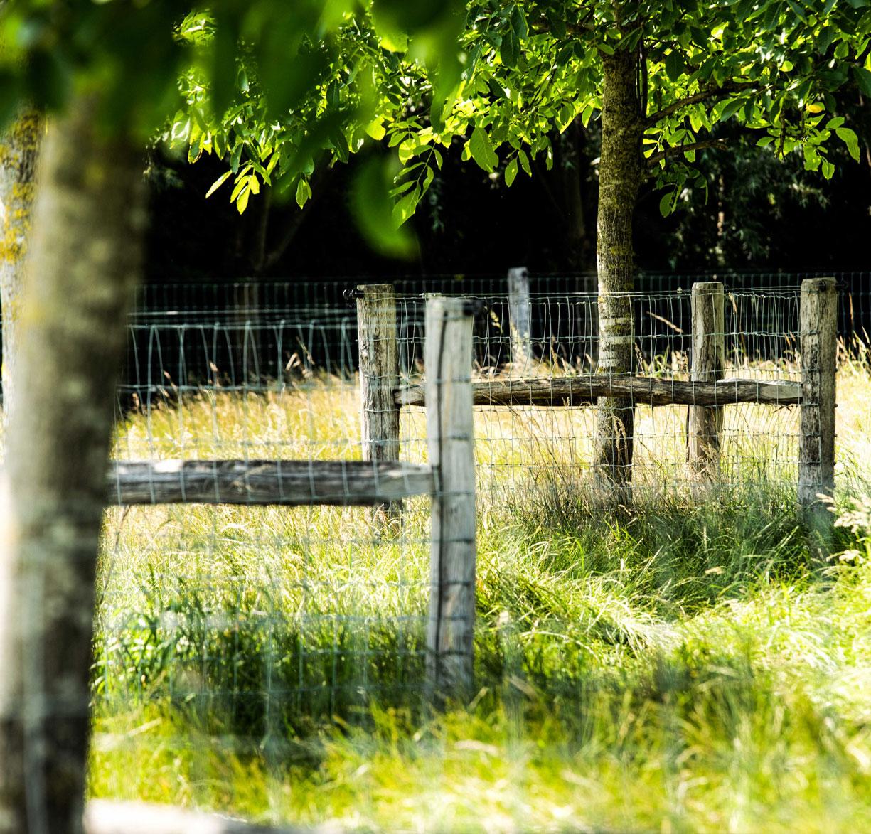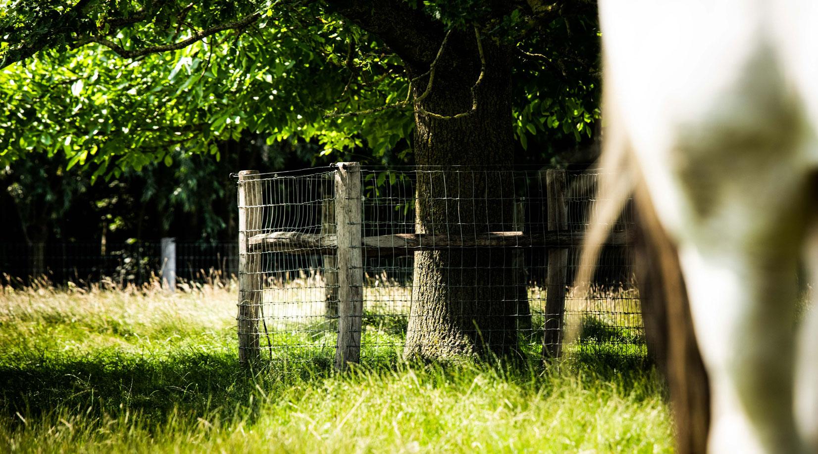 Een subtiele draadgaasomheining met robuuste houten palen beschermt de boom zonder het landschap te verstoren. Dankzij een wire protect tot op de grond bescherm je de stam van de boom tegen grote én kleine grazers.