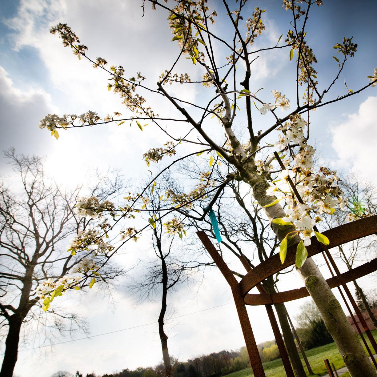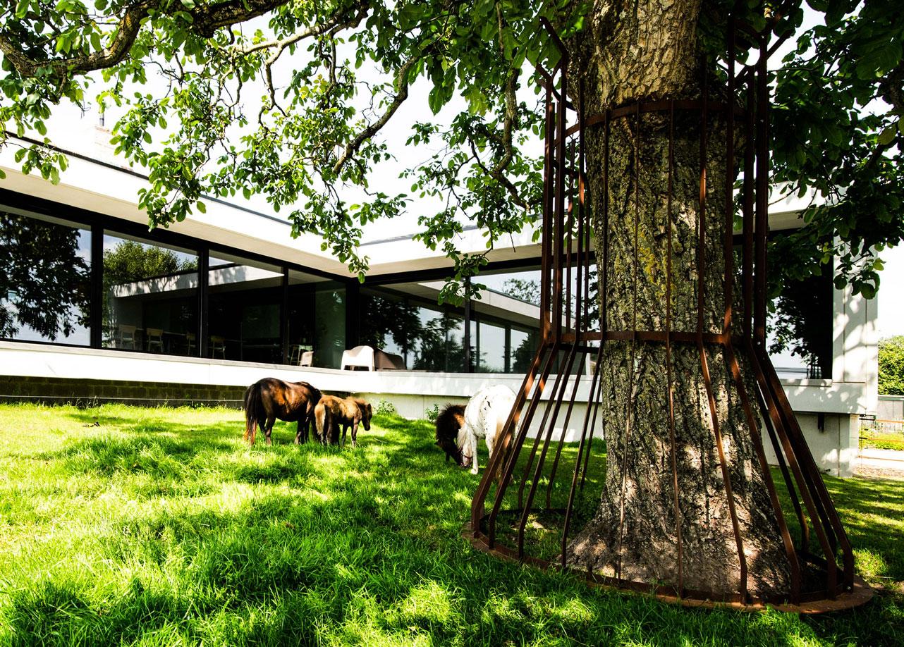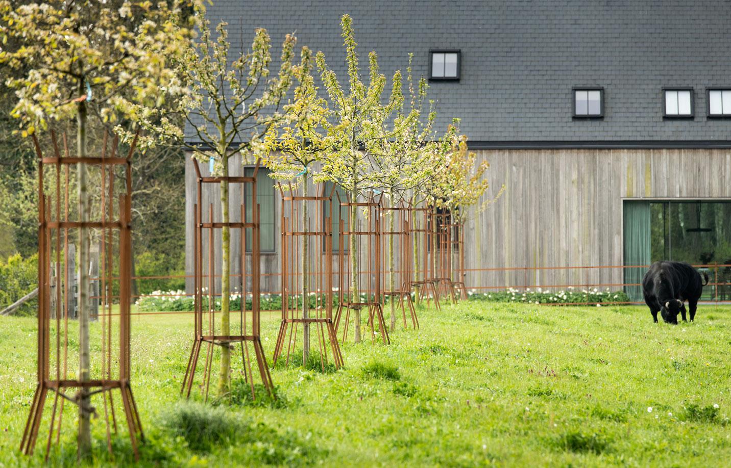 De bruine patine van het weervaste staal sluit perfect aan bij de kleur van de boomstam. De stevig verankerde Cortûre Protect omhelst de boom en beschermt hem tegen grote én kleine grazers.