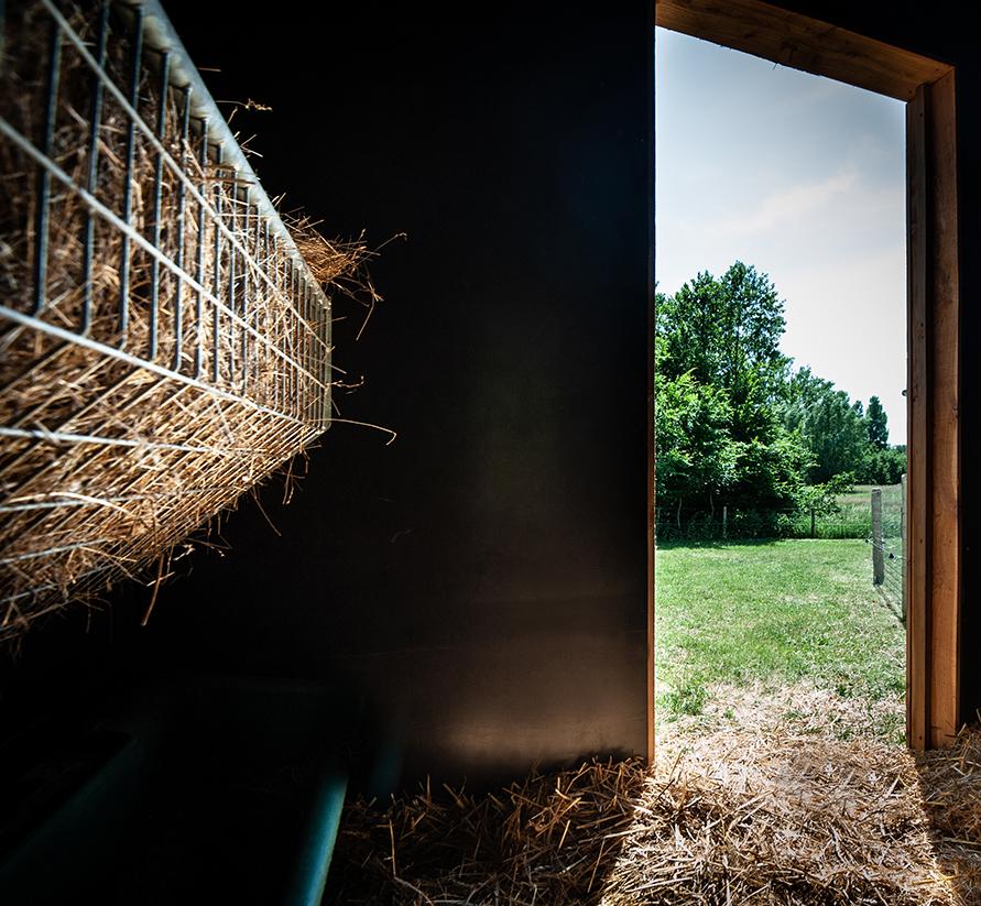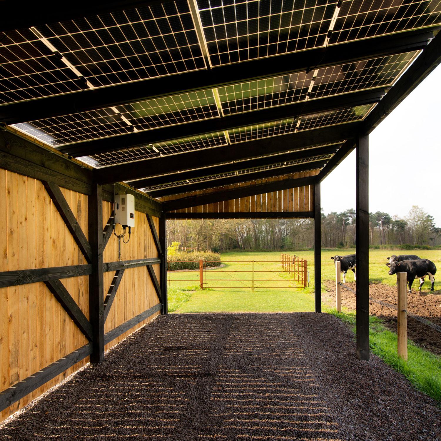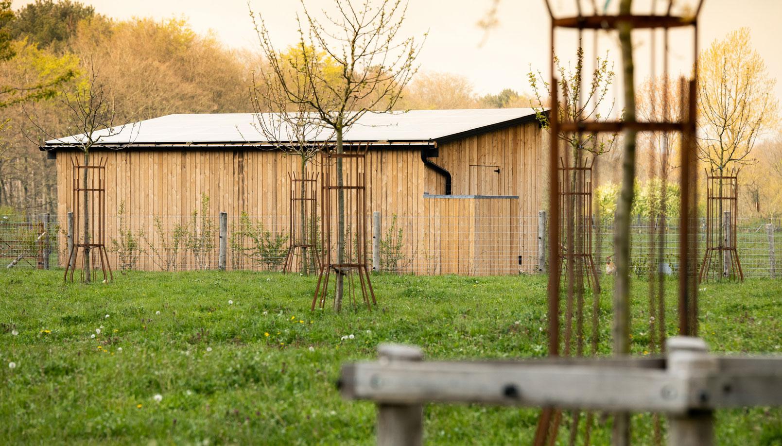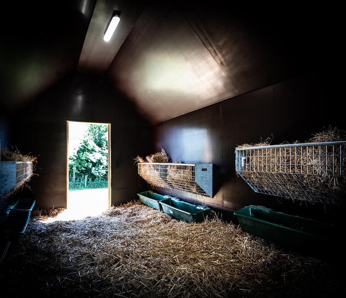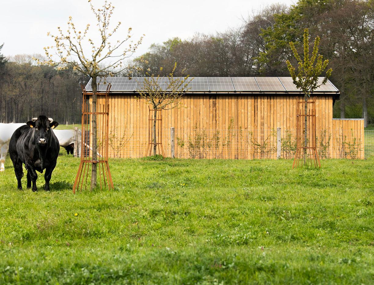Vanop afstand lijkt dit een gewone – zij het zeer mooie – veldschuur. Maar als je dichterbij komt, zie je hoe ecologie en bescherming gecombineerd werden. Je weidedieren staan droog onder het waterdichte dak van zonnepanelen. De basis van zwart constructiehout en een gevel in spaceboarding met een gezaagde plank houdt hen veilig. De waterdoorlatende ondergrond van lava/grind gaat naadloos over in de verharde graszones.