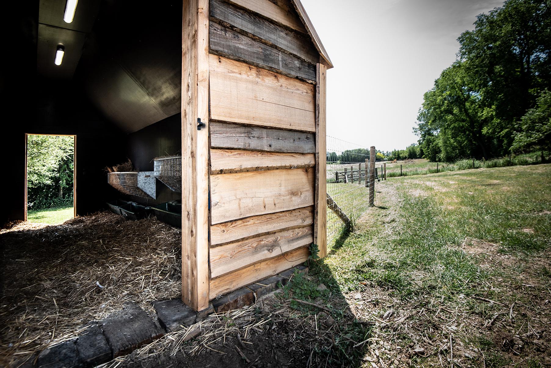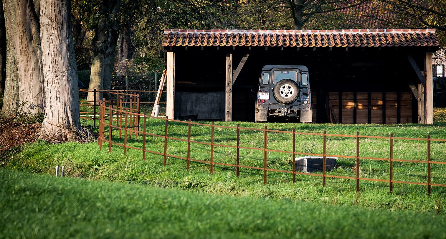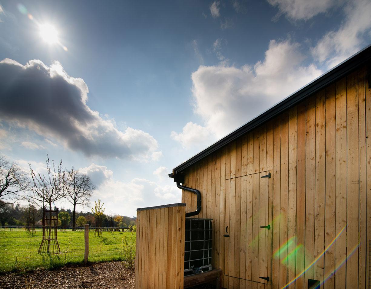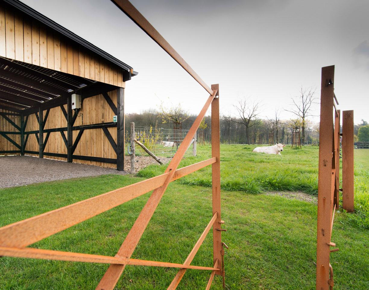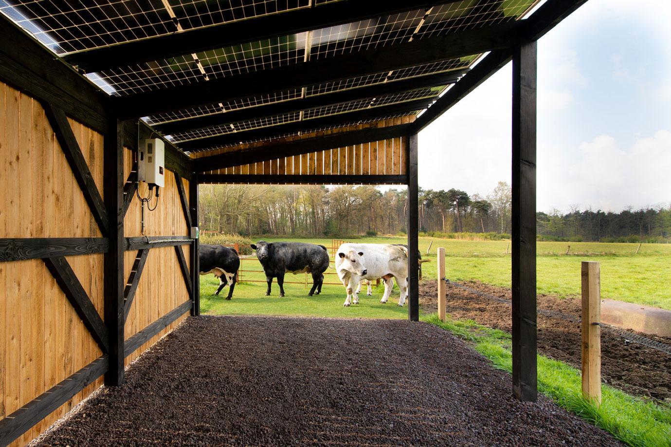 Vanop afstand lijkt dit een gewone – zij het zeer mooie – veldschuur. Maar als je dichterbij komt, zie je hoe ecologie en bescherming gecombineerd werden. Je weidedieren staan droog onder het waterdichte dak van zonnepanelen. De basis van zwart constructiehout en een gevel in spaceboarding met een gezaagde plank houdt hen veilig. De waterdoorlatende ondergrond van lava/grind gaat naadloos over in de verharde graszones.