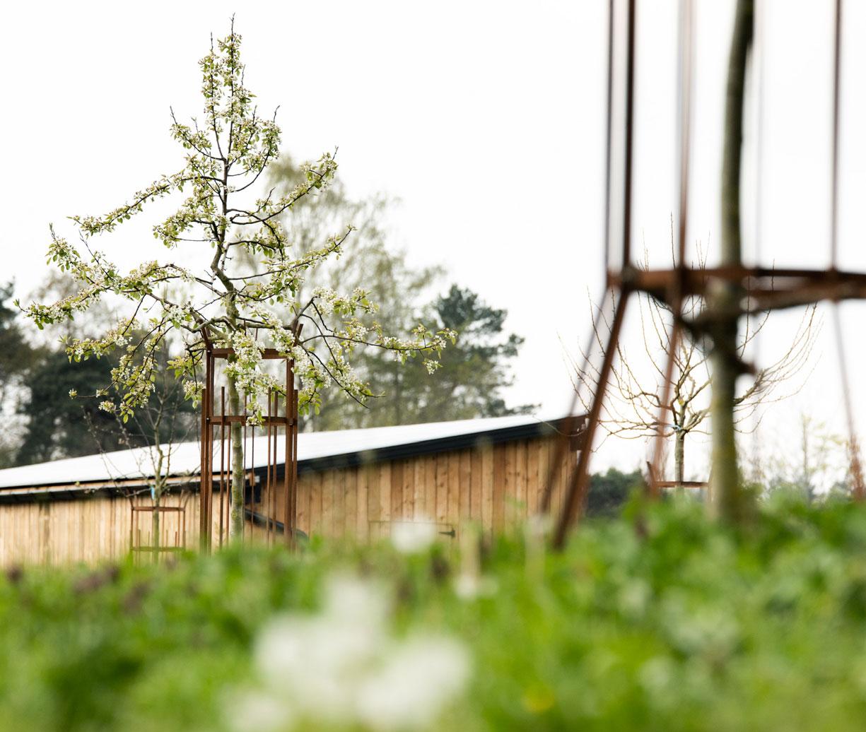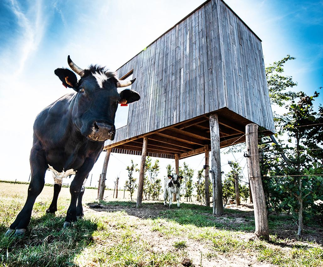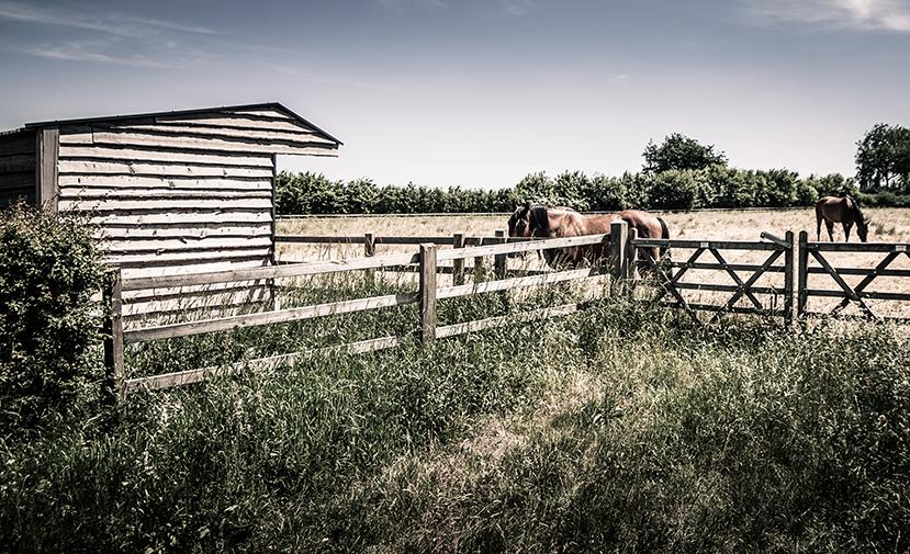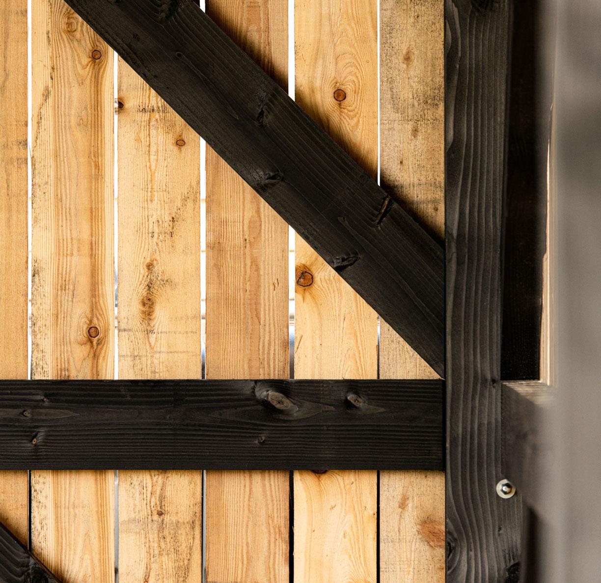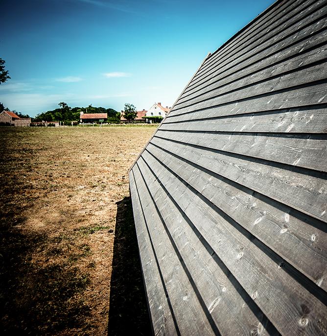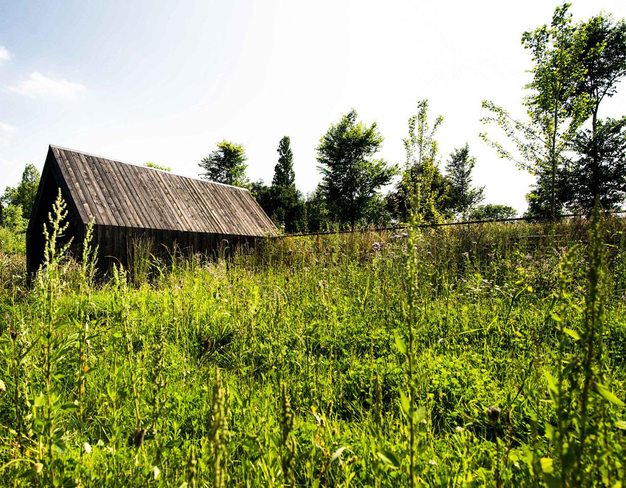 Vanop afstand lijkt dit een gewone – zij het zeer mooie – veldschuur. Maar als je dichterbij komt, zie je hoe ecologie en bescherming gecombineerd werden. Je weidedieren staan droog onder het waterdichte dak van zonnepanelen. De basis van zwart constructiehout en een gevel in spaceboarding met een gezaagde plank houdt hen veilig. De waterdoorlatende ondergrond van lava/grind gaat naadloos over in de verharde graszones.