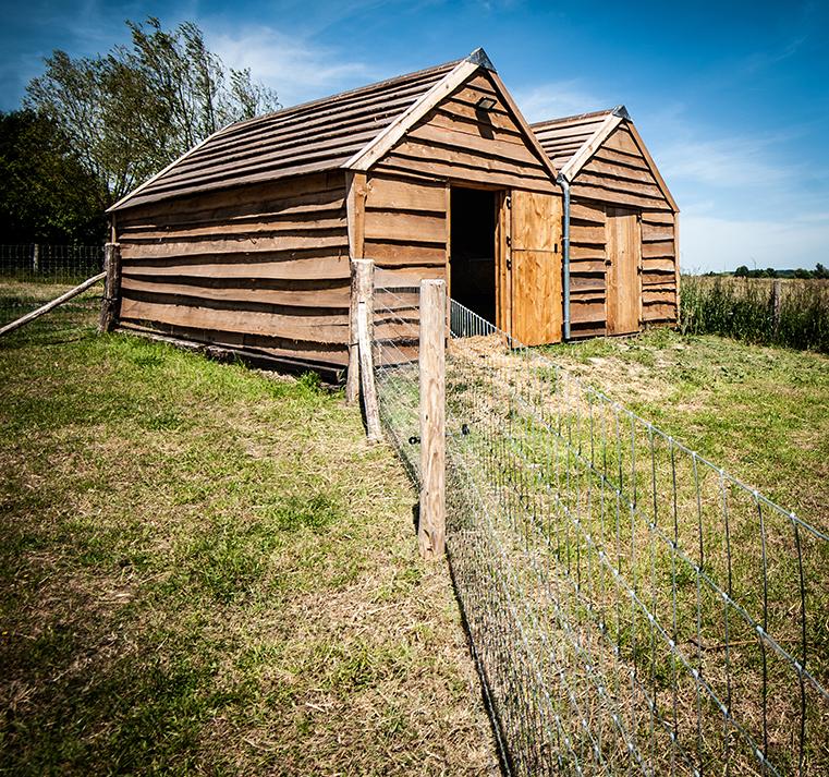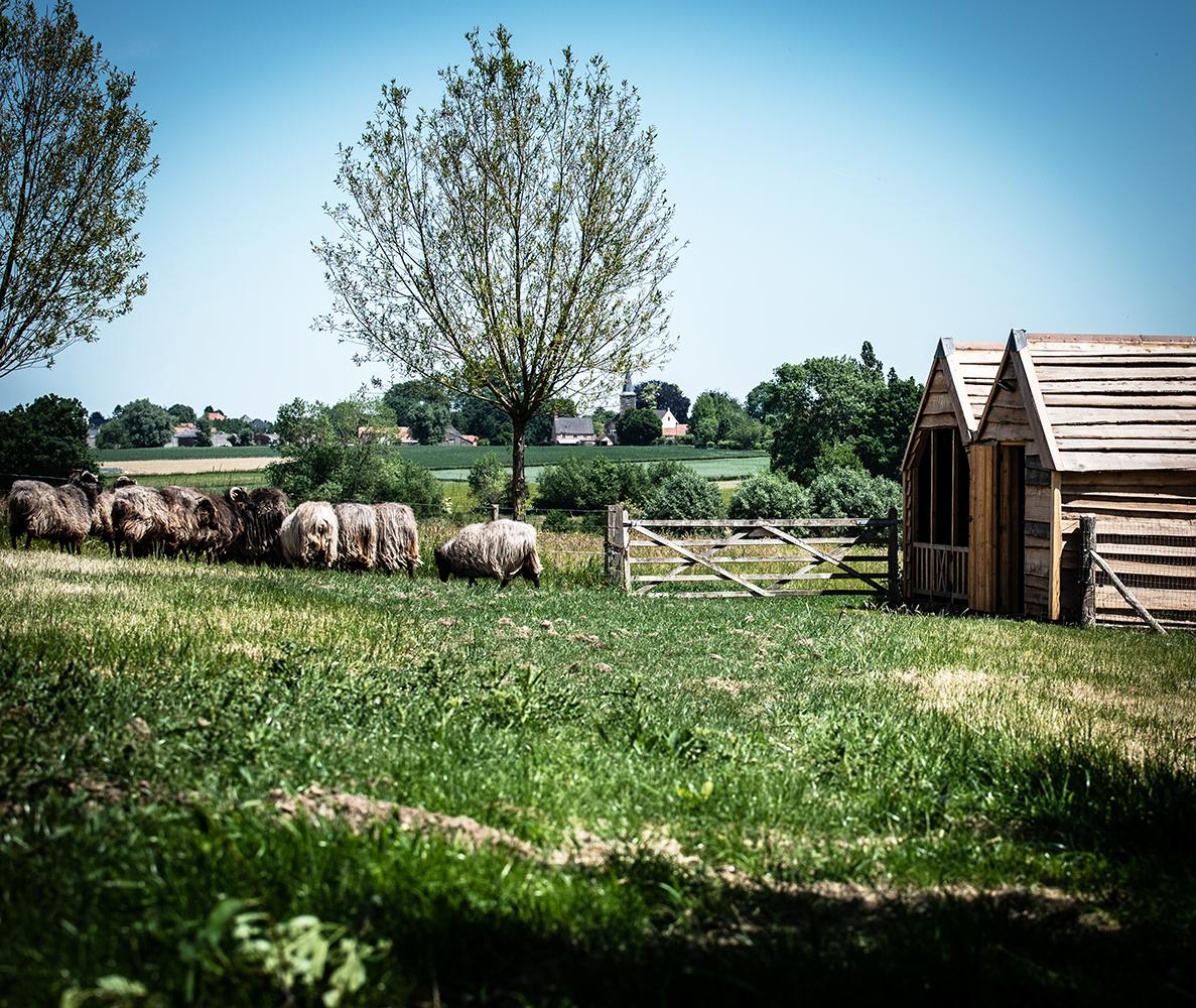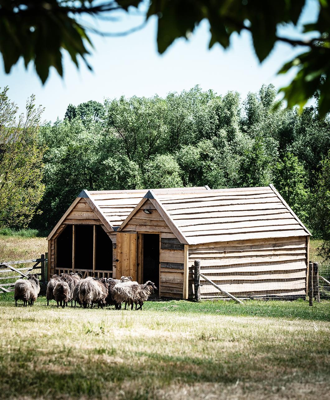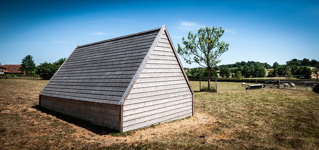 Een echte thuis voor je schapen, gebaseerd op de typische shelters die je ziet in de Engelse biolandbouw. De constructie rust op 6 palen die we machinaal in de grond heien. De binnenkant voorzien we van weervaste, afwasbare platen. De buitenkant werken we af in een houtbeslag dat natuurlijk vergrijst.