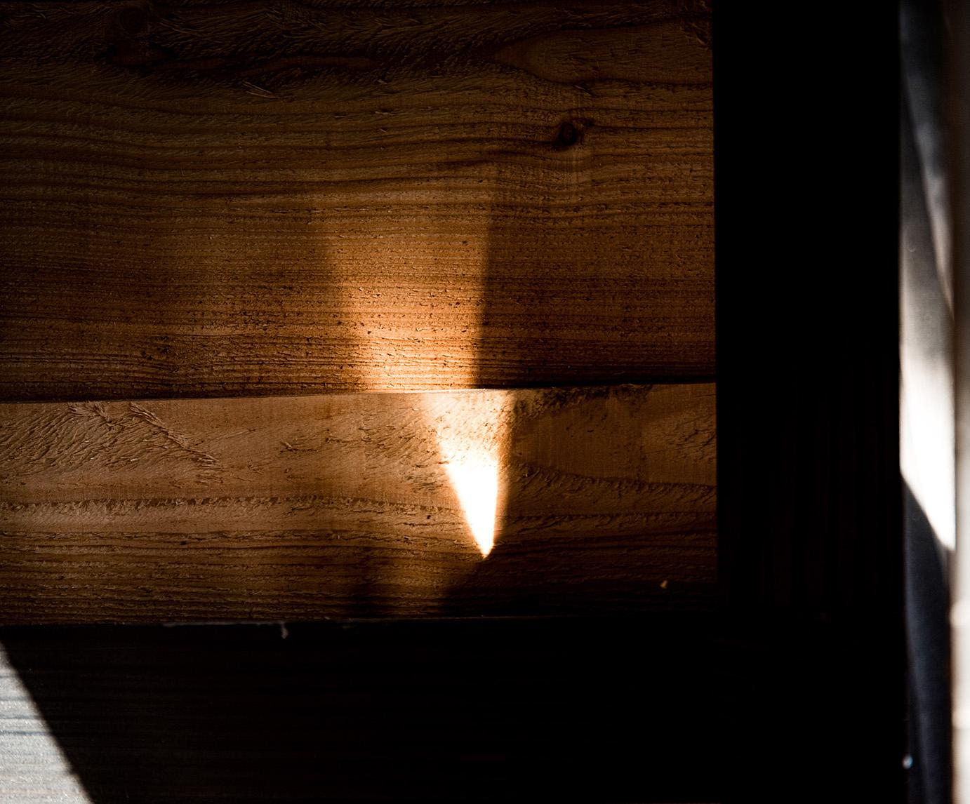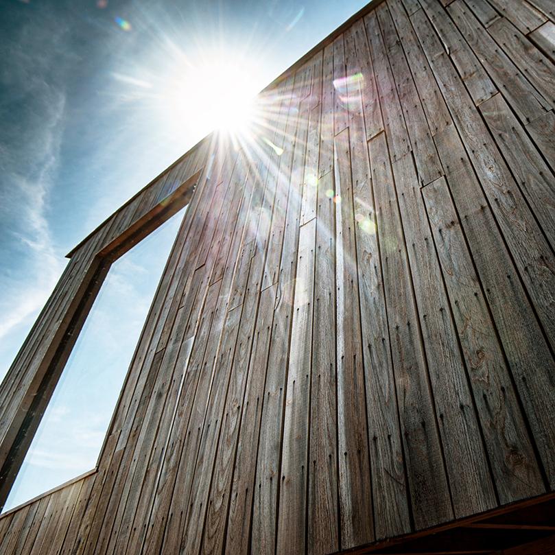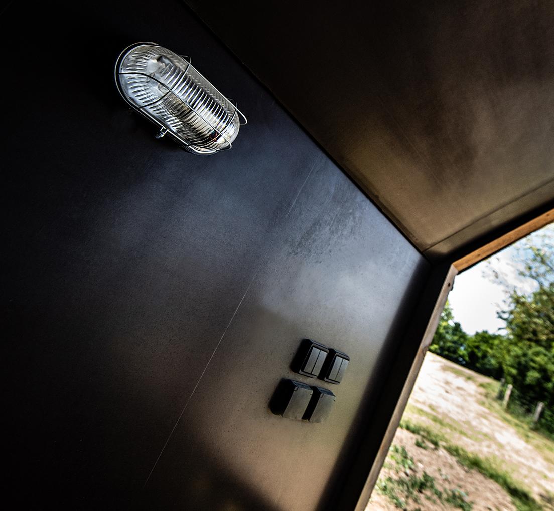 Aan de binnenkant voorzien we alle nodige technieken, zoals water en elektriciteit. De vloer bestaat uit ongelijke houten balken: waterdoorlaten en makkelijk schoon te maken.