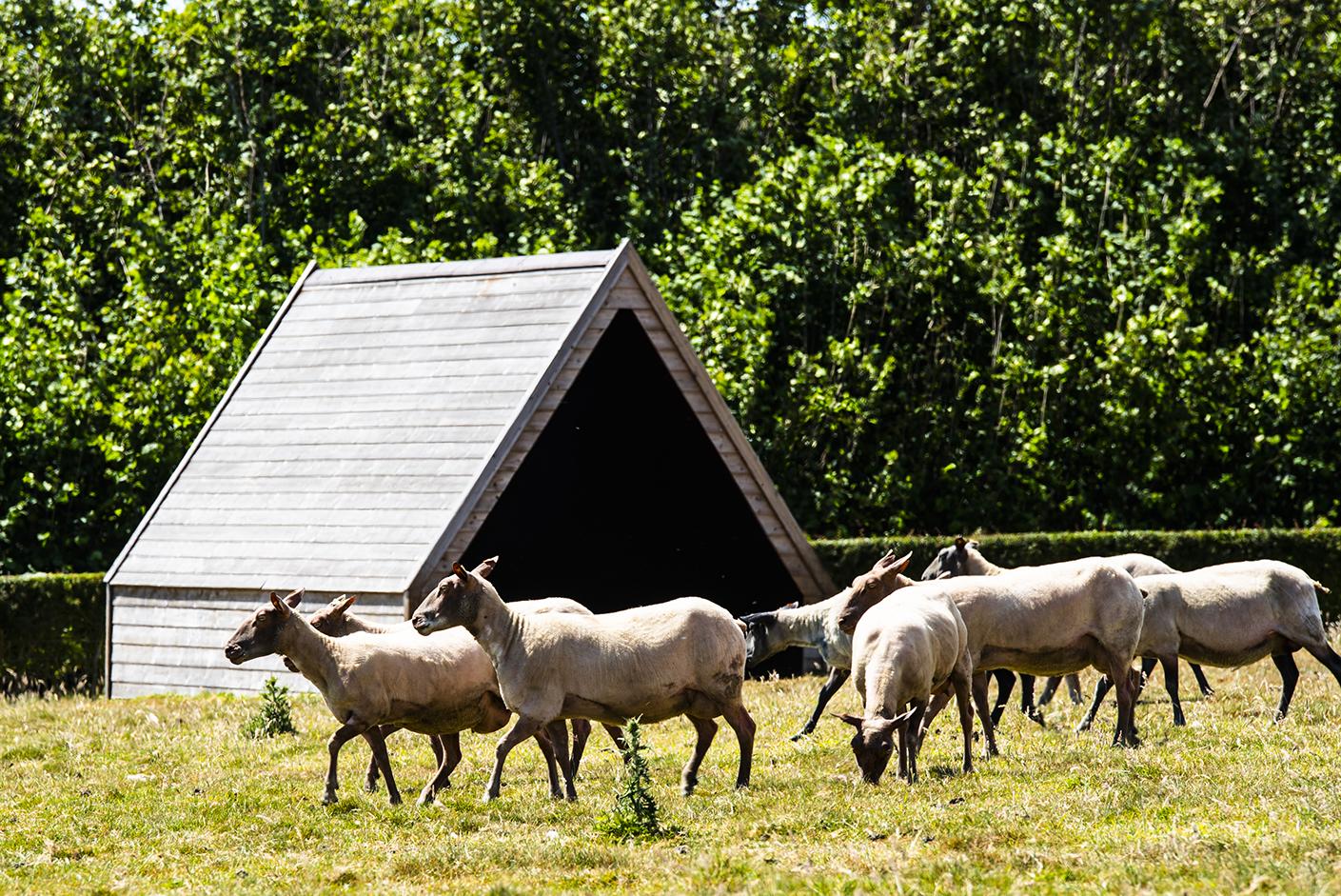 Vanop afstand lijkt dit een gewone – zij het zeer mooie – veldschuur. Maar als je dichterbij komt, zie je hoe ecologie en bescherming gecombineerd werden. Je weidedieren staan droog onder het waterdichte dak van zonnepanelen. De basis van zwart constructiehout en een gevel in spaceboarding met een gezaagde plank houdt hen veilig. De waterdoorlatende ondergrond van lava/grind gaat naadloos over in de verharde graszones.
