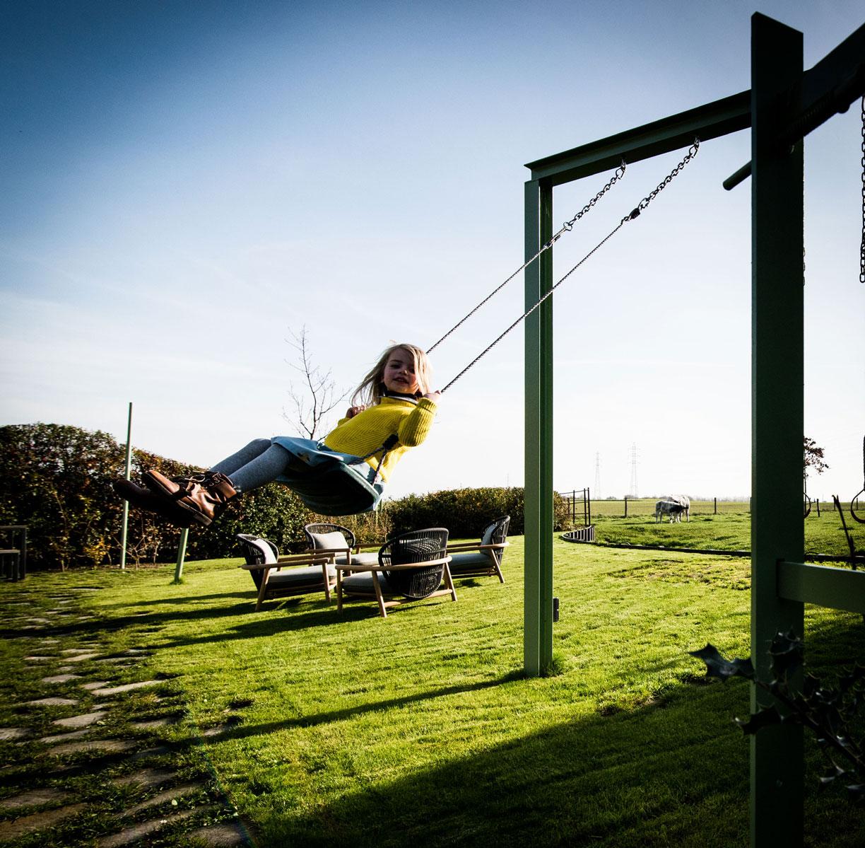 Wij houden wel van een uitdaging. Dus als een klant ons vraagt om “de buiten naar binnen te trekken”, dan doen we er alles aan om het huis en de omgeving volledig met elkaar in harmonie te brengen. Vanuit de woning heb je een weids zicht op de zwemvijver, de boomgaard, de rundveeweides met stalling en achterliggende bossen. Geen tierlantijntjes, maar strakke omheiningen die versmelten met het landschap.