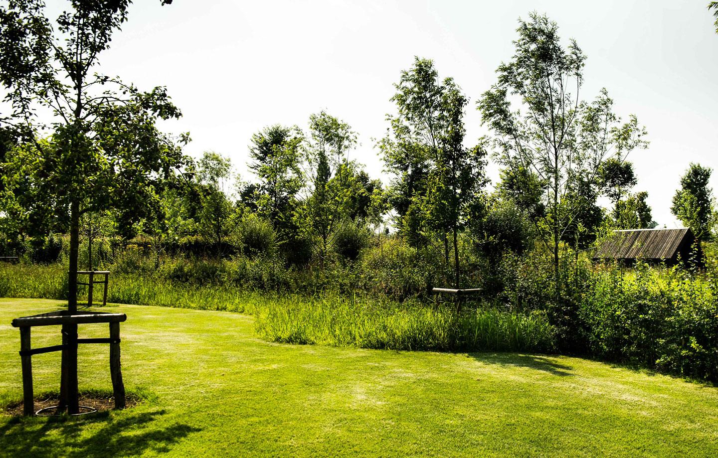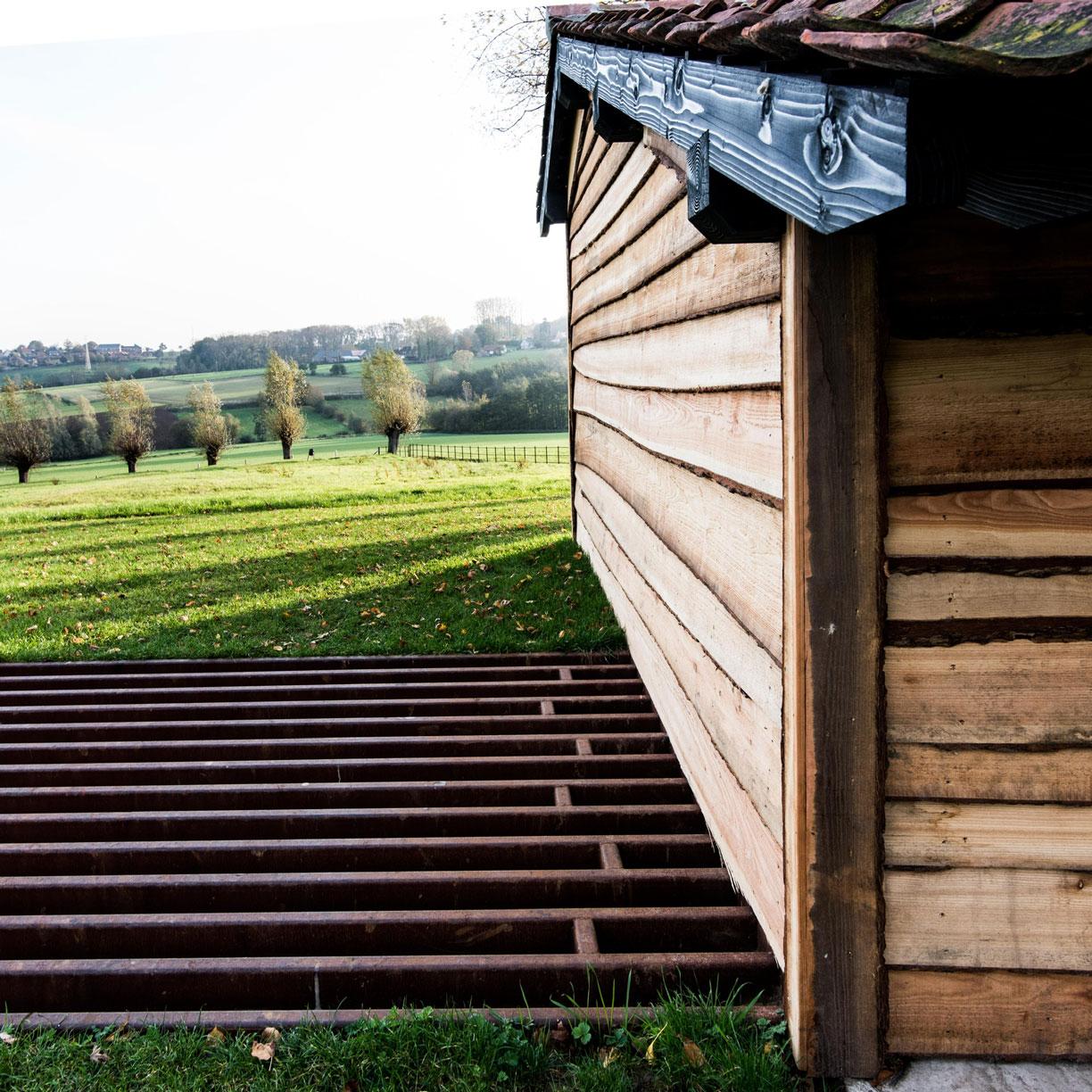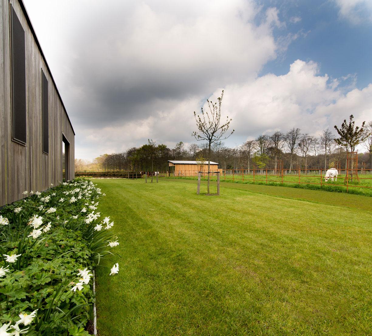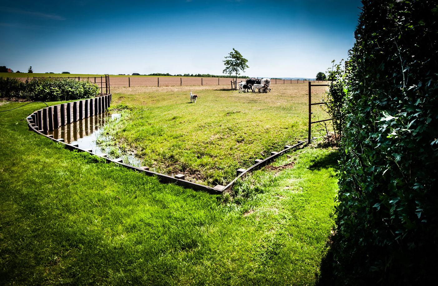 Dankzij de Ha-Ha-constructie vervaagt de grens tussen tuin en weide in wat wij een weidetuin noemen. Als je op het terras staat lijkt het alsof de dieren elk moment naast jou kunnen komen staan. De Cattle Grid ondersteunt dit effect en dankzij de boomhut/schuilstal geniet het volledige gezin volop van hun tuin, weide en dieren.