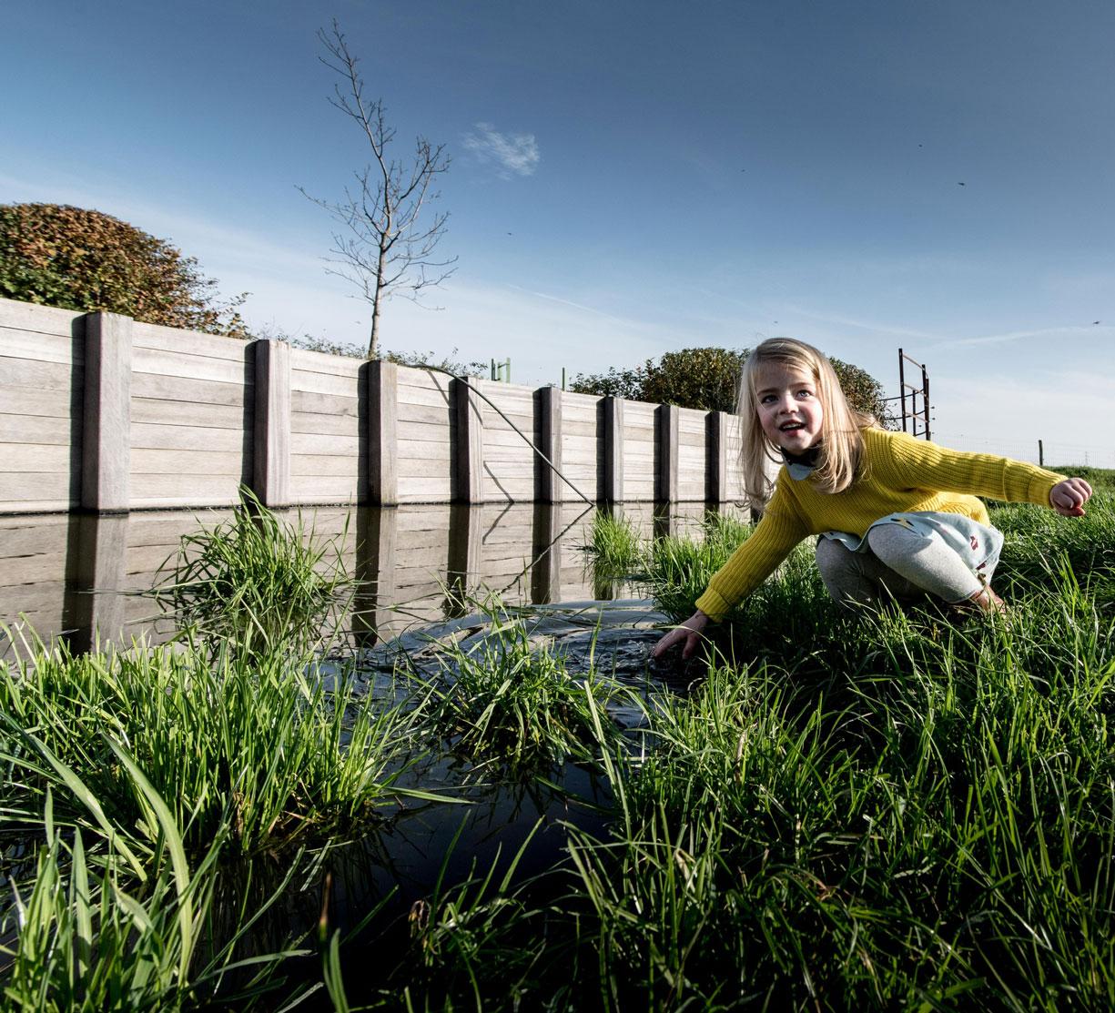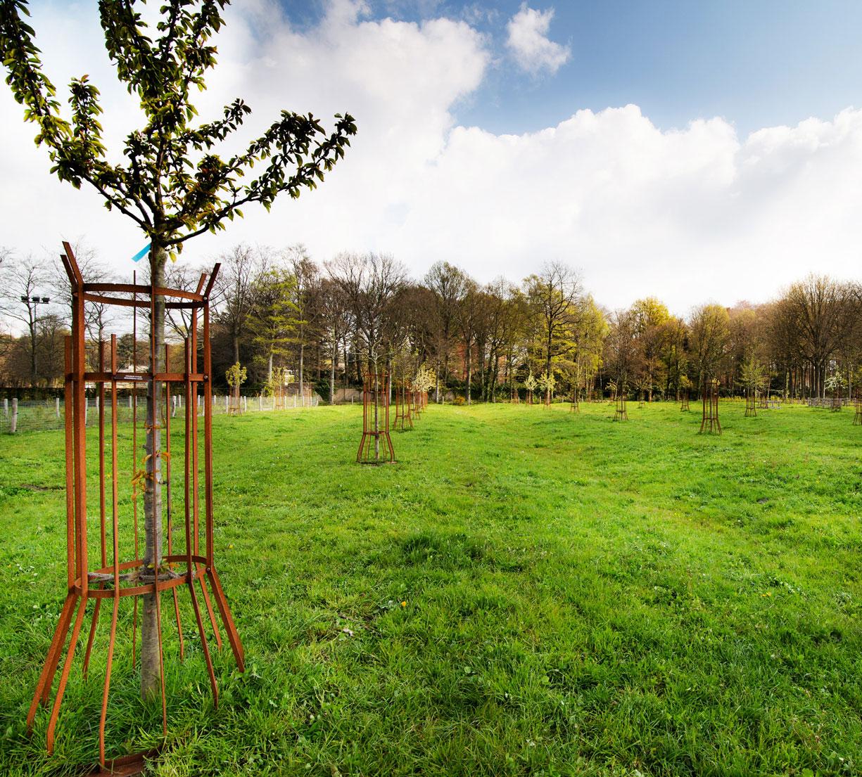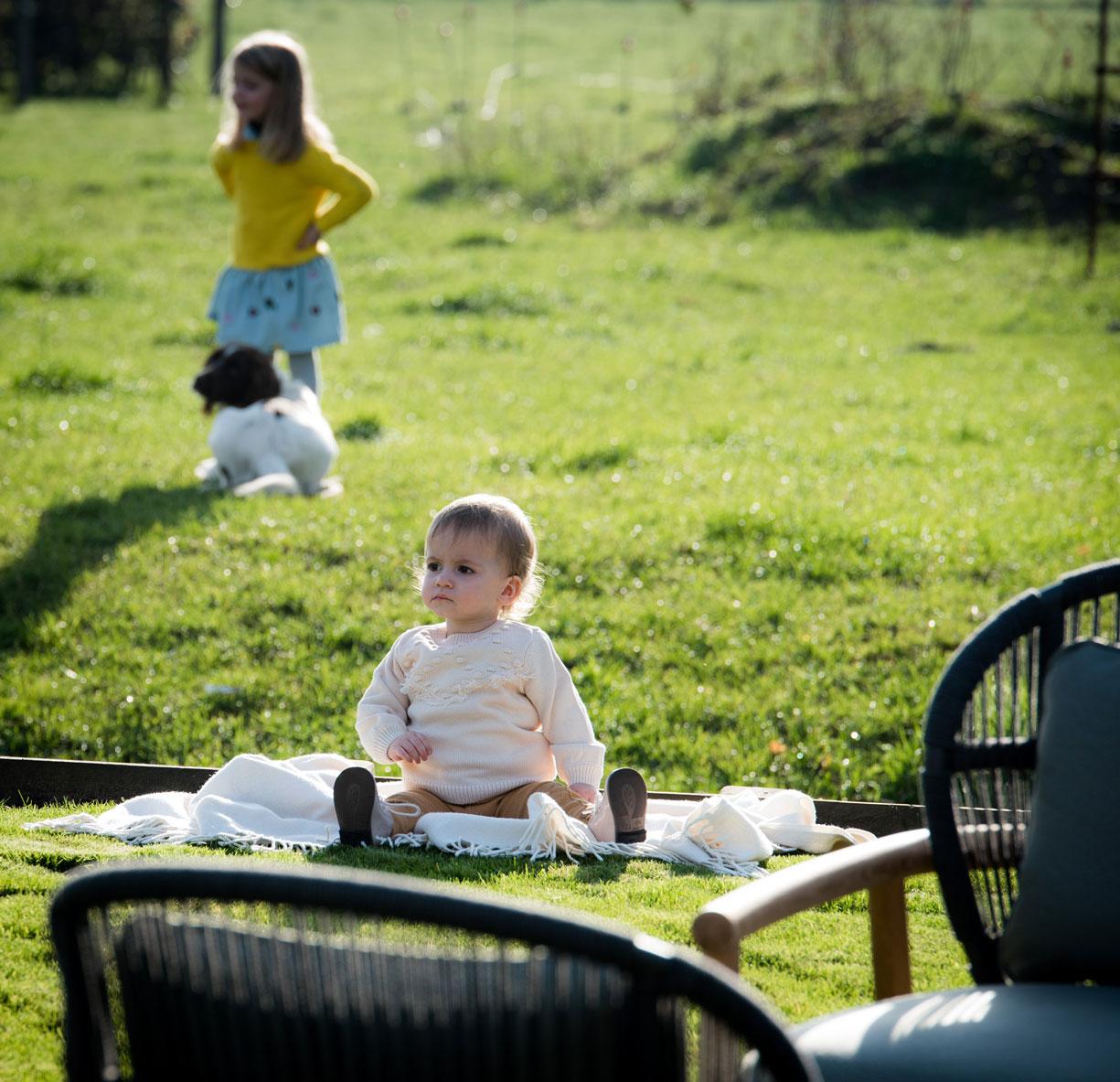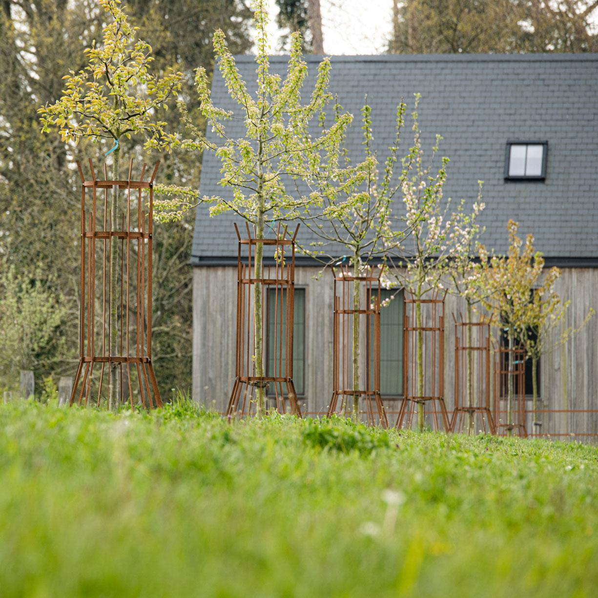 Dankzij de Ha-Ha-constructie vervaagt de grens tussen tuin en weide in wat wij een weidetuin noemen. Als je op het terras staat lijkt het alsof de dieren elk moment naast jou kunnen komen staan. De Cattle Grid ondersteunt dit effect en dankzij de boomhut/schuilstal geniet het volledige gezin volop van hun tuin, weide en dieren.