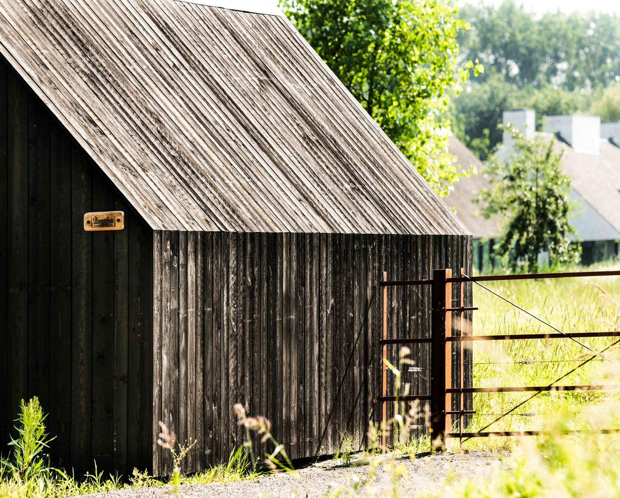 Vanop afstand lijkt dit een gewone – zij het zeer mooie – veldschuur. Maar als je dichterbij komt, zie je hoe ecologie en bescherming gecombineerd werden. Je weidedieren staan droog onder het waterdichte dak van zonnepanelen. De basis van zwart constructiehout en een gevel in spaceboarding met een gezaagde plank houdt hen veilig. De waterdoorlatende ondergrond van lava/grind gaat naadloos over in de verharde graszones.